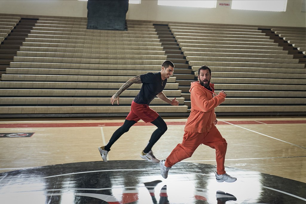 HUSTLE. (L-R) Juancho Hernangomez as Bo Cruz and Adam Sandler as Stanley Sugerman in Hustle. Cr. Scott Yamano/Netflix © 2022.