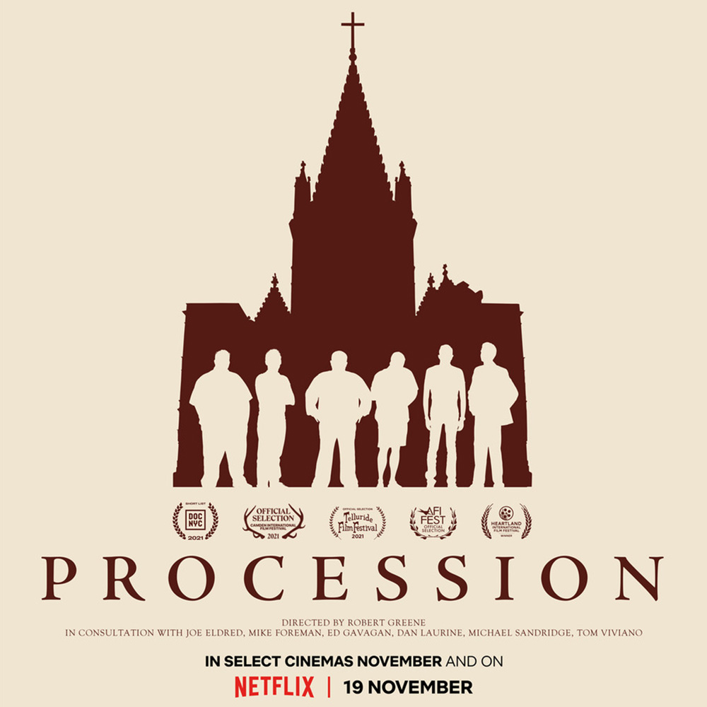 Procession. (L to R) Michael Sandridge, Dan Laurine and Ed Gavagan in Procession. Cr. Netflix © 2021